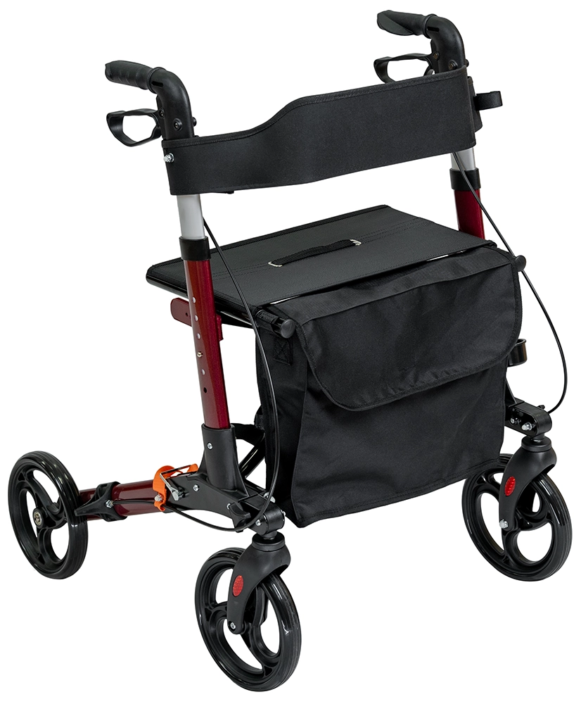 Dve sprednji vrtljivi in zložljivi kolesi, dve zadnji nogi se zložita za zelo kompaktno velikost zloženega rolatorja.